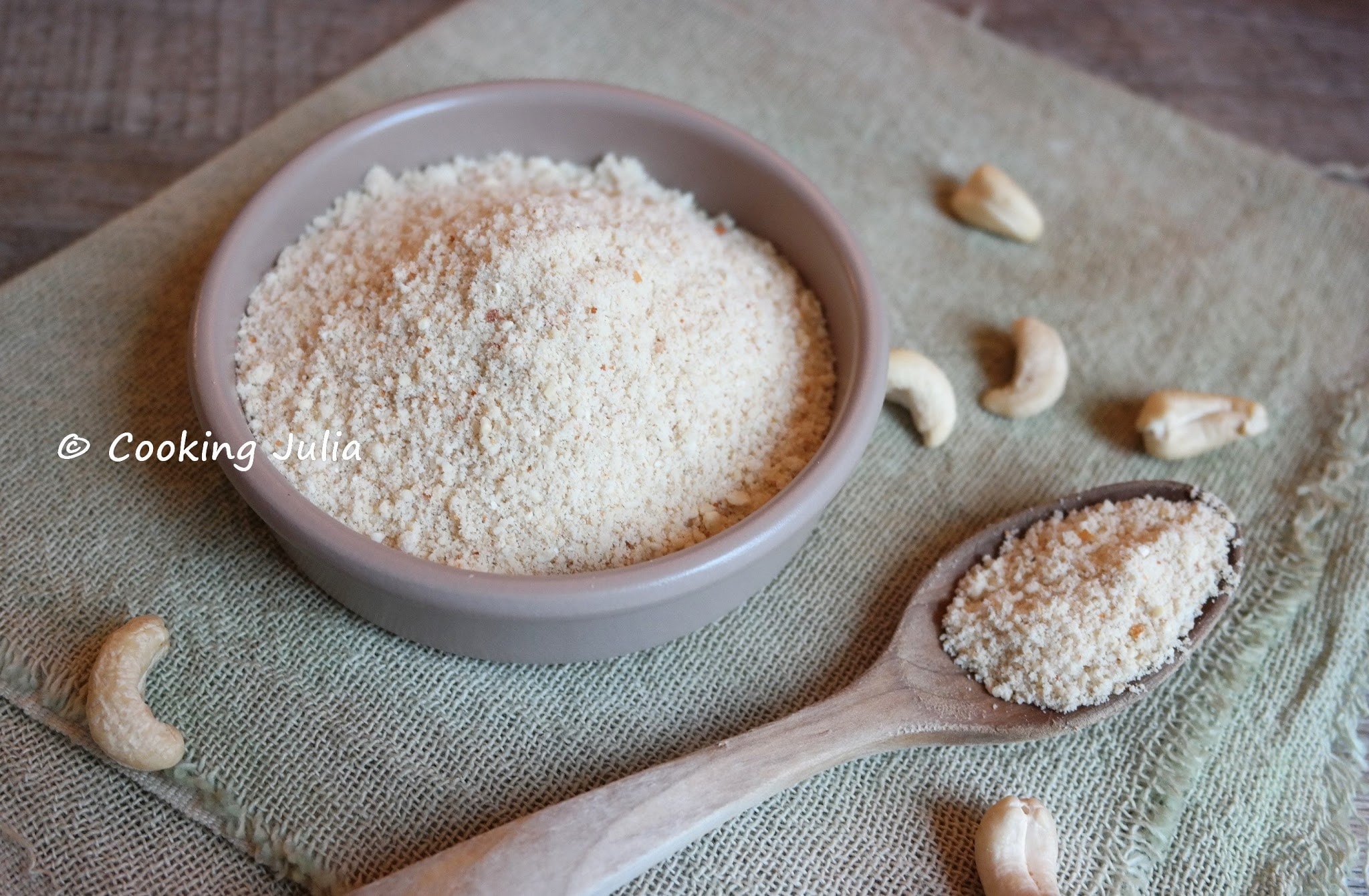 Mettre les noix de cajou dans le bol du Thermomix. Donner 2 à 3 impulsions de turbo pour les réduire en miettes. Programmer ensuite 2 à 3 secondes, vitesse 7, en surveillant bien. Attention de ne pas mixer trop longtemps sous peine de voir la poudre de noix se transformer en pâte.